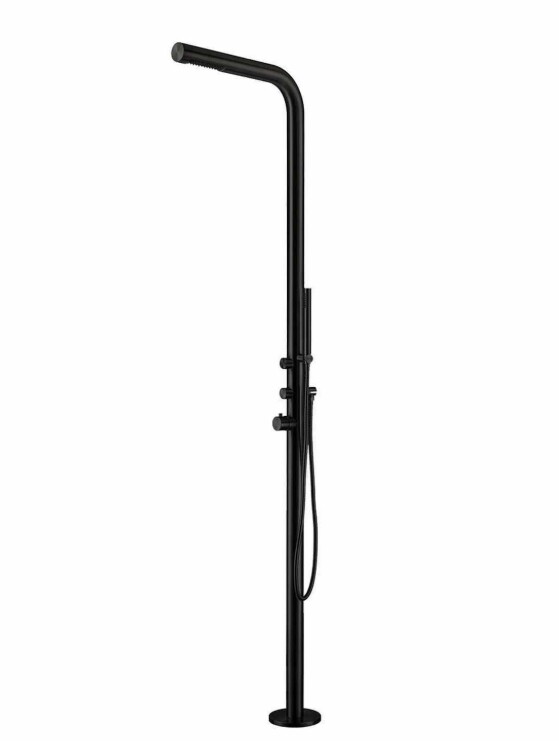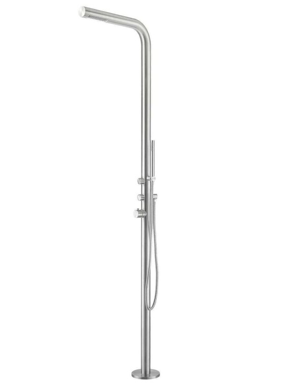 Dușul de exterior model BUDONI este realizat din oțel inoxidabil satinat AISI Inox 316L, cu alimentare pentru apă caldă și rece, înălțime 2210 mm. Este ideal atât pentru utilizare comercială, cât și privată, pentru piscine exterioare și interioare, grădini sau pentru baia de acasă.