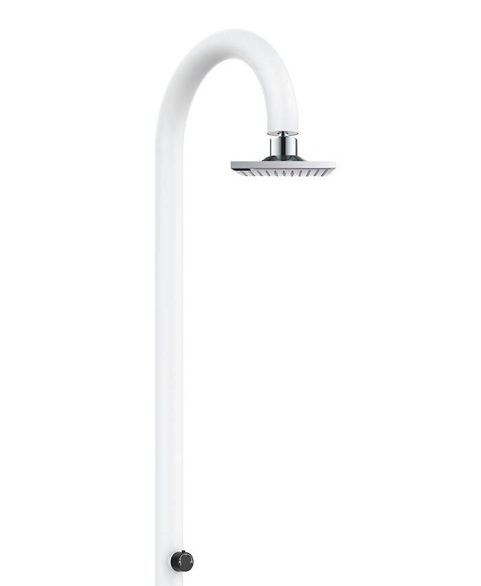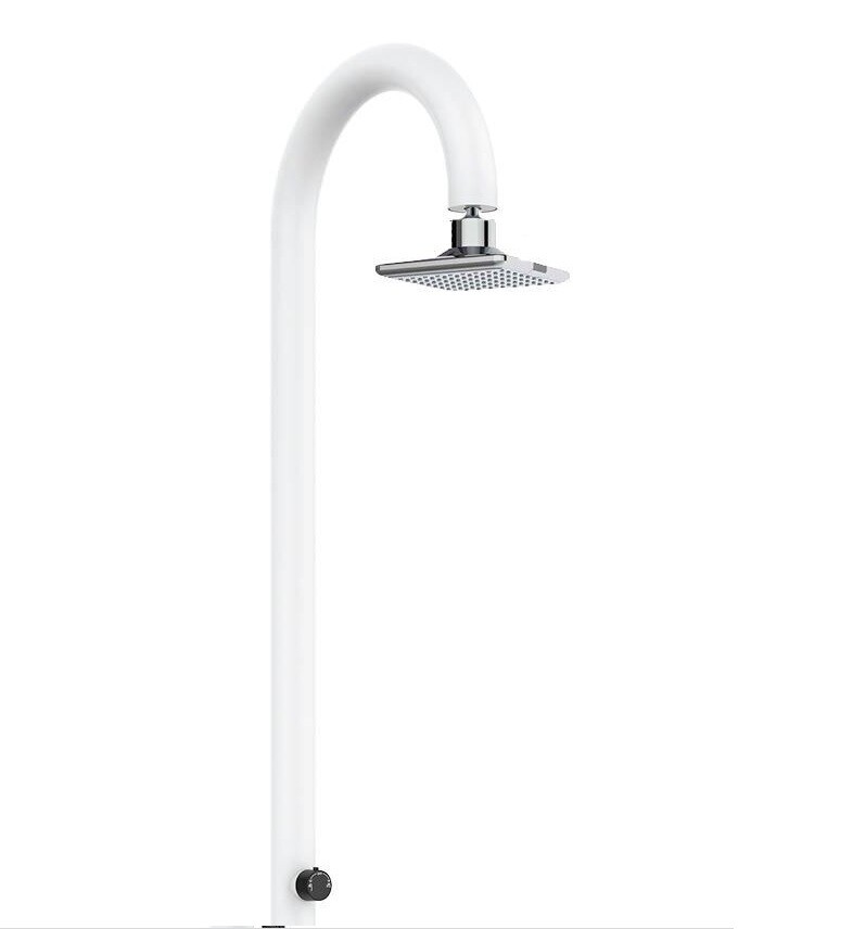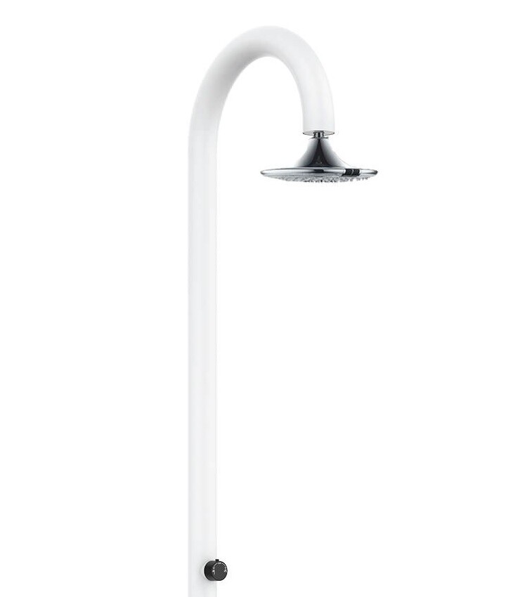 Duș White Moon din aluminiu, pentru apă caldă și rece, prevăzut cu mixer de temperatură și spălător pentru picioare. Conectare dublă la apă, inferioară și laterală, instalabil atât în interiorul, cât și în exteriorul locuinței, complet echipat.