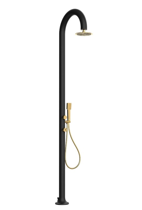 Dușul elegant din aluminiu negru și auriu, proiectat cu un cap de duș circular și duze anticalcar, oferă o experiență de neegalat atât cu apă caldă, cât și cu apă rece. Datorită conexiunilor duble la apă, este perfect adaptat pentru spațiile interioare și exterioare ale locuinței.